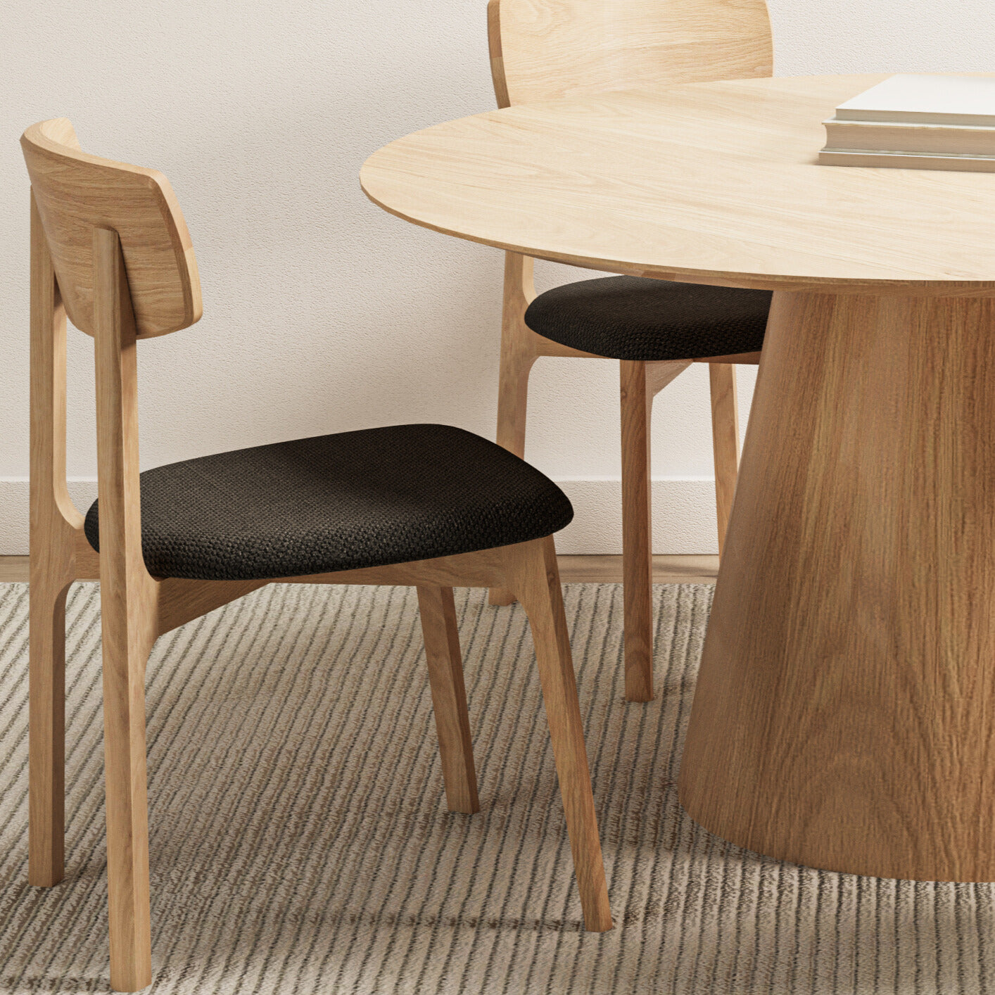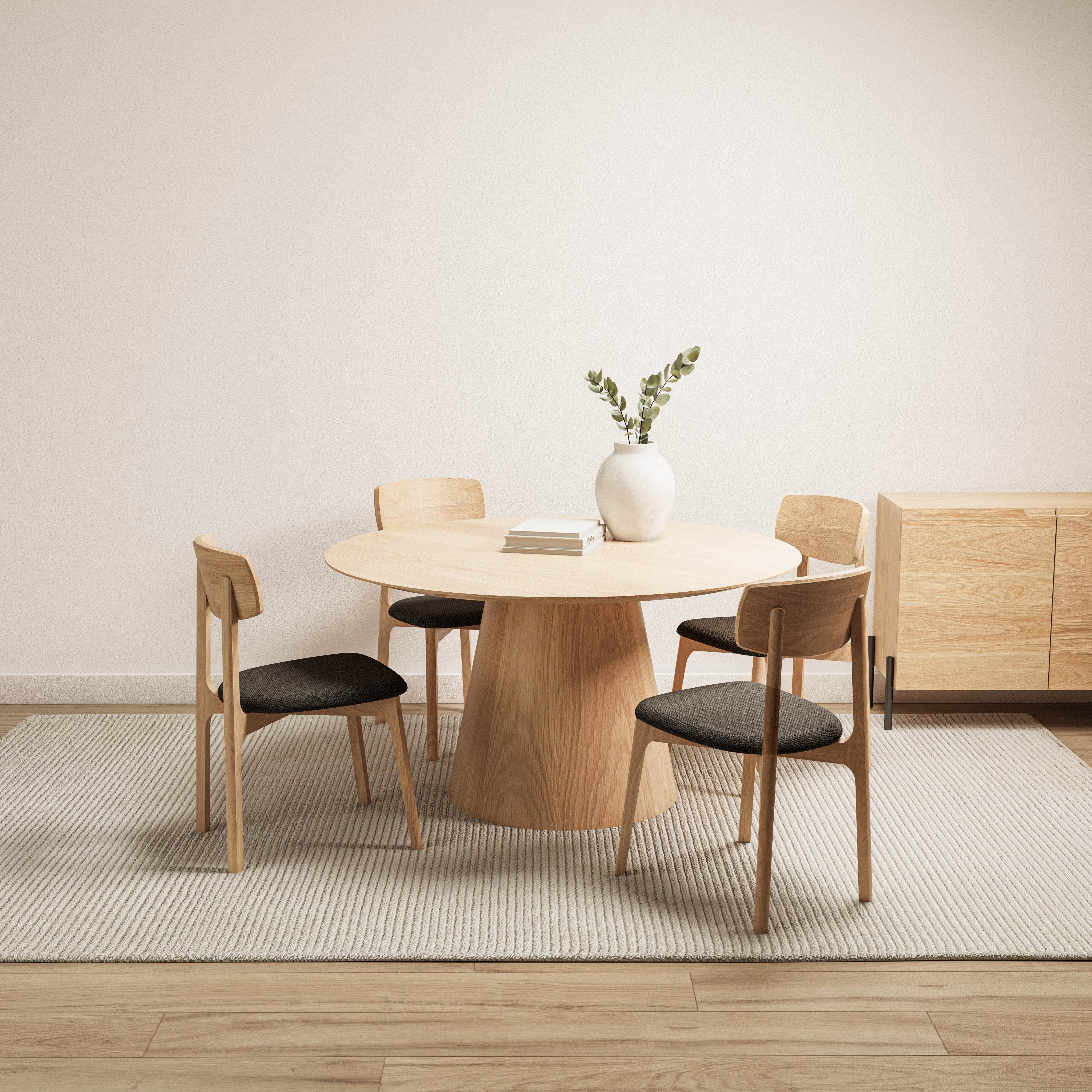 La Table Pinot se distingue par son plateau rond en bois massif qui crée une atmosphère naturellement chaleureuse et rassembleuse. Sa base conique, à la fois solide et élégante, lui donne une présence minimaliste et affirmée au centre de la pièce. C'est la table à manger idéale pour ceux qui aiment conjuguer design et fonction.
